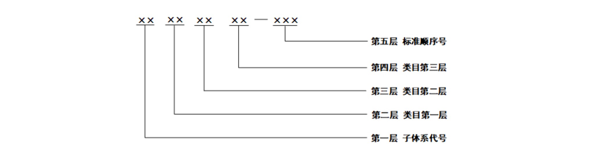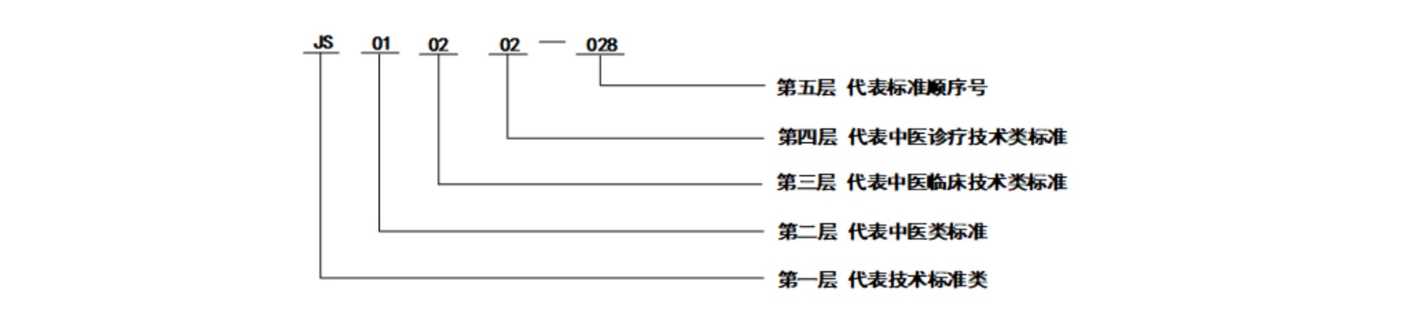 4.中医药工作标准,是由中医药机构(企业)自行制定的岗位职责和工作定额等内部规范性文件,包括单位内部的工作制度和规章等,它们是单位内部管理的依据和正常工作的保障。可分为:通用工作标准、中医医疗工作标准、中药药事工作标准、中医药教育工作标准、中医药科研工作标准、中医药信息工作标准、中医养生保健工作标准、中医药文化宣传工作标准、中医药国际合作交流工作标准、其他工作标准等10个类目。 依据《中华人民共和国标准化法》规定,不将工作标准纳入行业认证管理范畴,但为保证中医药标准体系的完整性,将工作标准子体系列入中医药标准体系之中,但其标准目录不纳入本标准体系表的明细表。 二、中医药标准体系编号规则 中医药标准体系的层次编号和标准代号采用二节式,以短横线分开,前面的是层次序列子体系代号和类目代号,后面的是顺序号。中医药标准体系编号结构如图2所示。