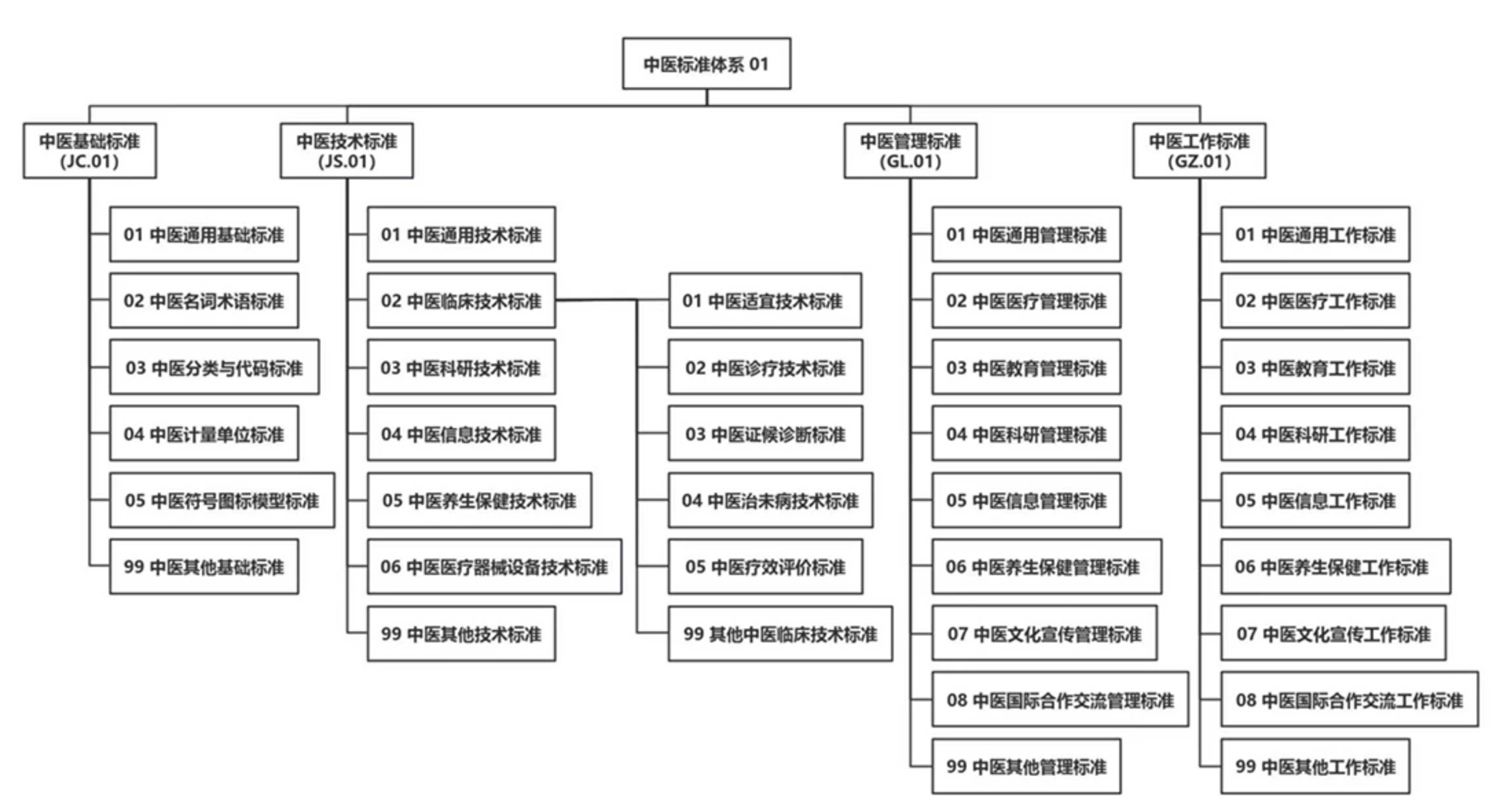 各省、自治区、直辖市中医药主管部门,新疆生产建设兵团卫生健康委,局机关各部门、直属各单位,全国中医药各专业标准化技术委员会,局中医药标准化工作办公室: 为进一步推动建立健全适合中医药发展的标准体系,促进标准化工作科学发展,清晰定位标准紧缺度、层级和优先级,我局组织制定了《中医药标准体系表(2025年版)》,现印发给你们,供指导中医药标准制修订工作。 国家中医药管理局综合司 2025年11月26日 (信息公开形式:主动公开) 中医药标准体系表(2025年版) 标准化是推进中医药治理能力和治理体系现代化的重要手段,对中医药事业高质量发展起着重要的基础性和引领性作用。构建标准体系是指导标准化工作科学发展的重要方法,对标准化工作有着重要的规划和引领作用。为进一步推动建立健全适合中医药发展的标准体系,促进标准化工作科学发展,我局组织制定了《中医药标准体系表(2025年版)》,用于指导中医药国家标准、行业标准制定紧密围绕中医药重点工作,清晰定位标准紧缺度、层级和优先级。《中医药标准体系表》是中医药领域制定标准的蓝图,也是今后一个时期编制中医药标准化规划、计划的基础和依据。 一、中医药标准体系框架设置 (一)总体结构。中医药标准体系分为基础标准、技术标准、管理标准和工作标准4个子体系,每一子体系下分为若干类目。主要的层次结构,如图1所示。 ![]()